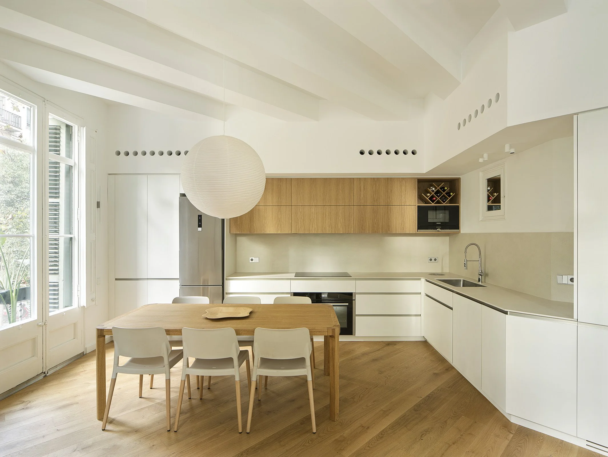The entire design process was born from the search for what was most essential and yet most lacking: light. Allowing light to cross and articulate the dwelling. The original home had an introspective composition: spaces compartmentalized by multiple partitions that obstructed the entry of natural light, hindered ventilation, and blurred the distinction between day and night areas. To address this, a radical redistribution was proposed, oriented towards enhancing the southeast façade as the day area, where the living room, dining room, and kitchen are arranged in a single space with greater solar exposure and are connected through a passageway to the study. At the center of the dwelling lie the main distributor and a bathroom, while the night area is protected within the interior of the block, taking advantage of indirect light and ensuring a sense of calm. The central distributor becomes a structuring element that facilitates visibility between areas, cross ventilation, and the permeability of light. The material palette reinforces this sense of spaciousness and warmth: white surfaces amplify natural light, while natural oak provides continuity and serenity, integrating flooring, carpentry, and furniture into a homogeneous language. At a volumetric level, the space gained comfort by establishing a more human scale (2.30 m) within a 3.70 m container, hierarchizing and framing the integrated elements such as the kitchen, wardrobes, and furniture. Tot el procés de disseny neix de la recerca d’allò més essencial i que a l’hora més hi en mancava: la llum. Deixar que la llum travessi i articuli l’habitatge. L’habitatge original presentava una composició introspectiva: espais compartimentats per múltiples envans que obstaculitzaven l’entrada de llum i dificultaven la ventilació natural i la diferenciació entre la zona de dia i la de nit. Per solucionar-ho, es va optar per una redistribució radical orientada a potenciar la façana sud-est com a zona de dia on la sala d’estar, menjador i cuina s’ubiquen en un sol espai on hi ha més radiació natural i es connecten a través d’un pas amb l’estudi . Al centre de l’habitatge s’hi troben el distribuïdor principal i un bany, mentre que la zona de nit queda protegida a l’interior d’illa aprofitant la llum indirecta i garantint una certa tranquil·litat. El distribuïdor central esdevé un element vertebrador que facilita la visibilitat entre àrees, la ventilació creuada i la permeabilitat lumínica. La paleta material reforça aquesta sensació d’amplitud i calidesa: les superfícies blanques multipliquen la llum i el roure natural aporta continuïtat i serenor, integrant paviment, fusteria i mobiliari en un llenguatge homogeni. A nivell volumètric, l’espai va guanyar confort establint una alçada més humana (2,30 m) dins d’un contenidor de 3,70 m, jerarquitzant i enmarcant els elements integrats com cuina, armaris i mobiliari.